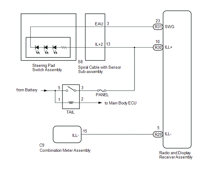 Power is supplied to the radio and display receiver assembly and steering pad switch assembly illumination when the light control switch is in the TAIL or HEAD position.
