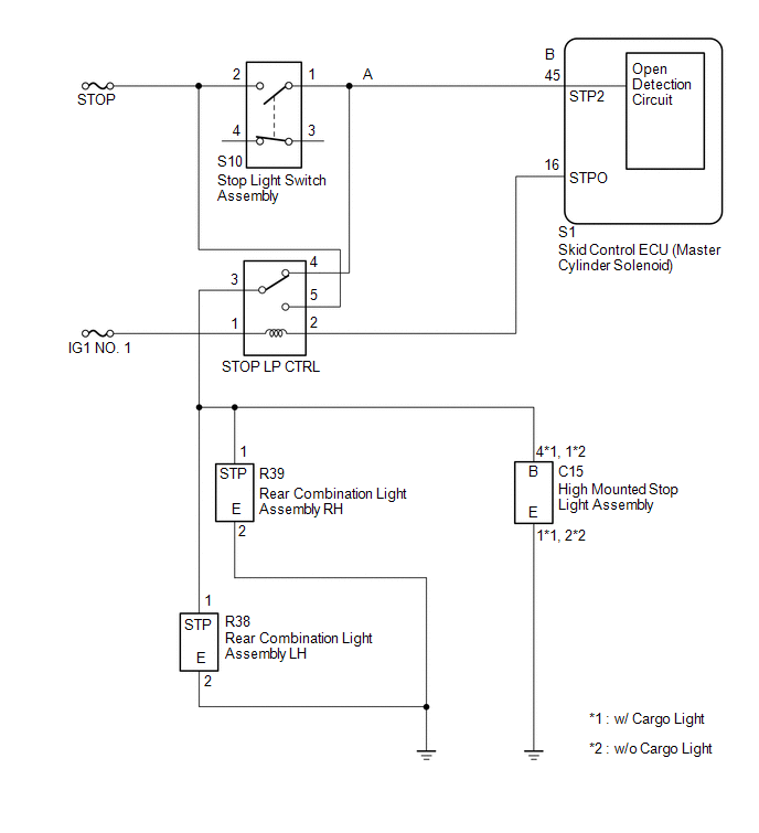 When the IG1 terminal voltage is between 9.5 and 17.4 V and the skid control ECU (master cylinder solenoid) STPO terminal output is off, an open in the stop light switch circuit (A to B, A to body ground) continues for 3 seconds or more. |
